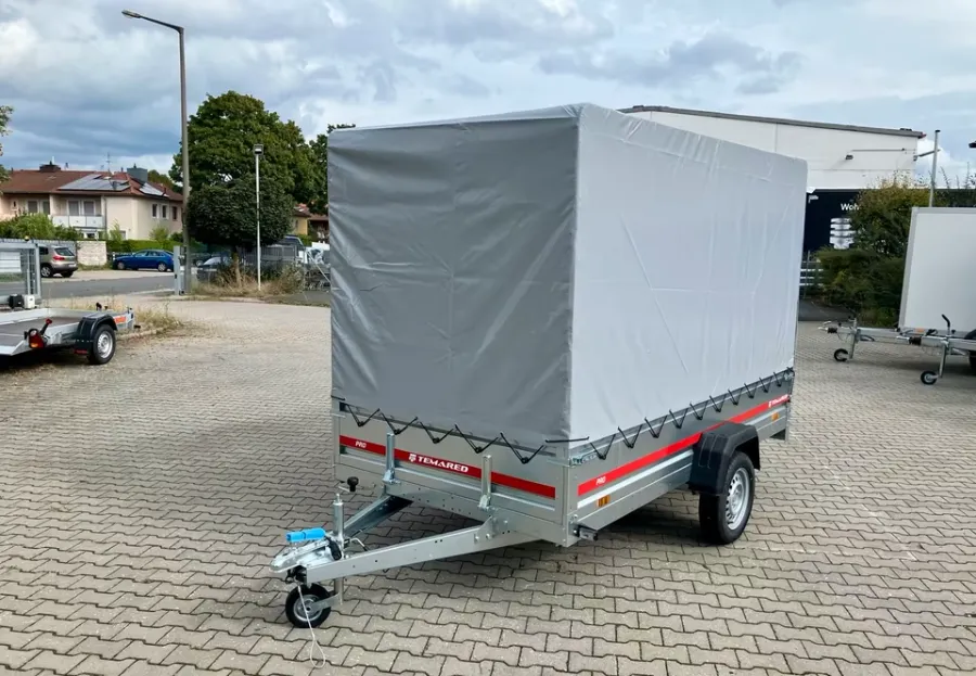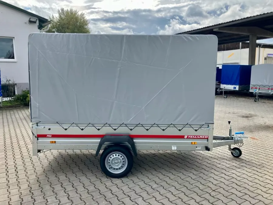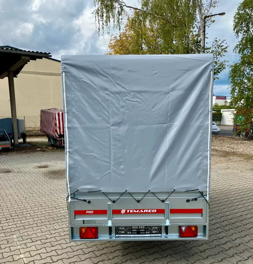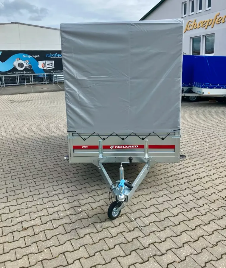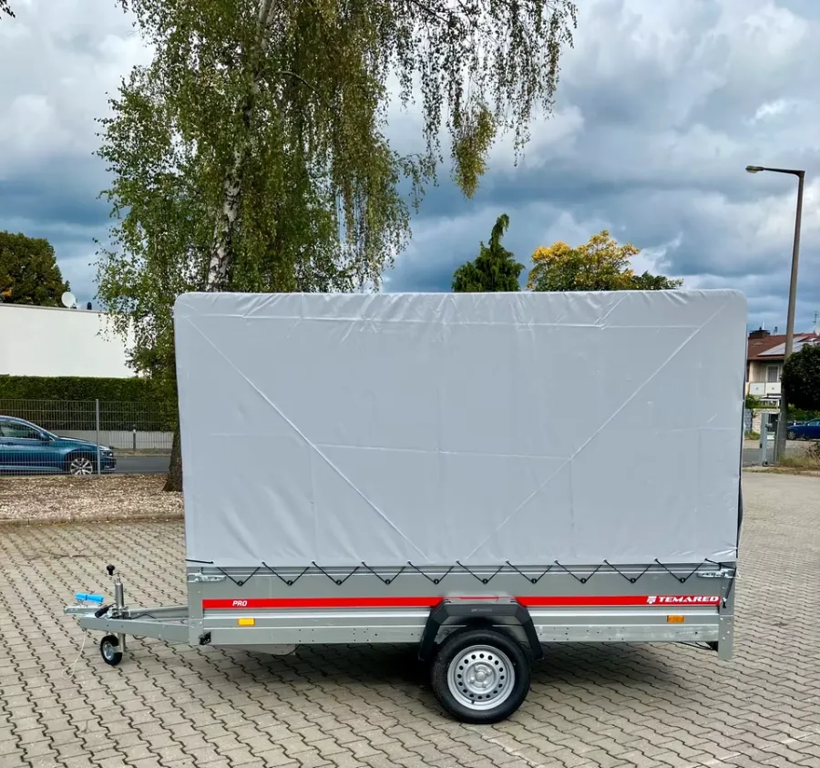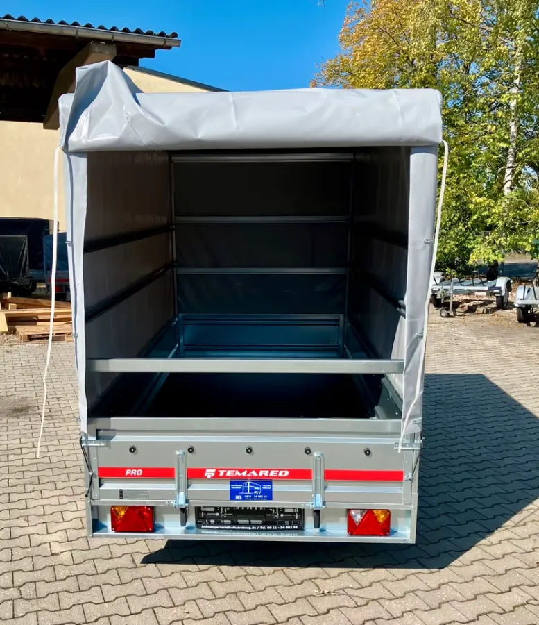 Der Anhänger von der Marke *Temared ist neu und besitzt 3 Jahre HU. Er ist ungebremst. Er ist einachsig. Die Bordwände können vorne und hinten geöffnet werden.