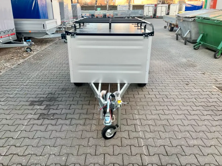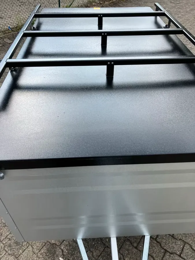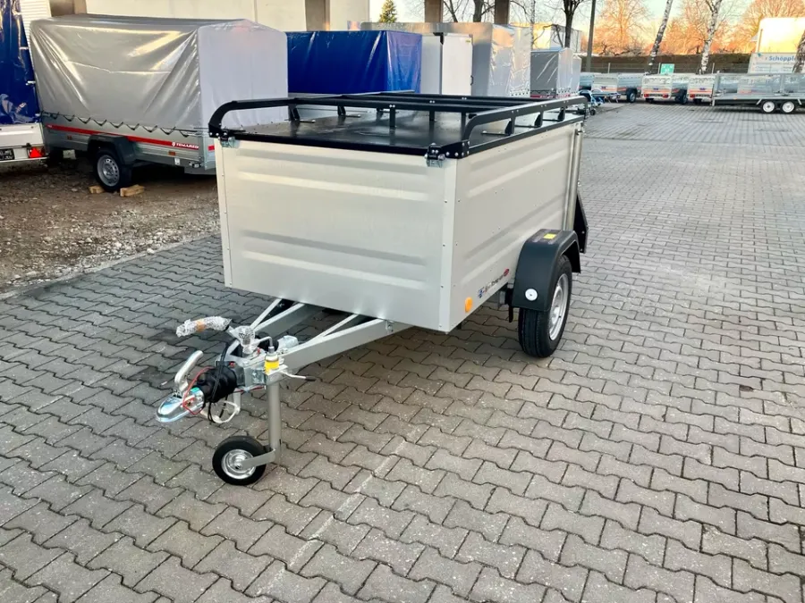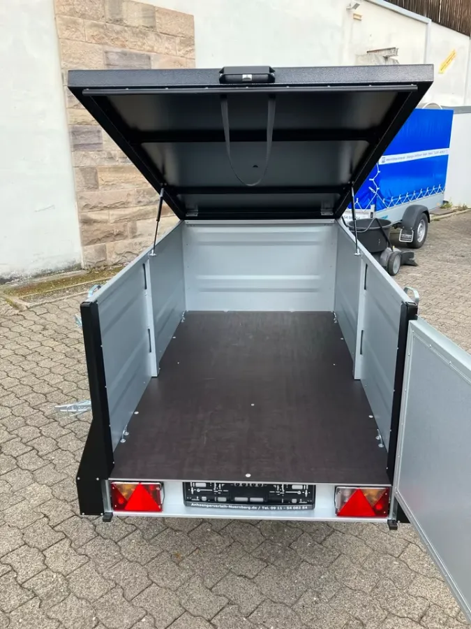 Der Kofferanhänger ist neu, gebremst und von der Marke *KT-EB2. Tragfähigkeit geschlossen: 75 kg (bis 250 kg mit 2 zusätzlichen Stoßdämpfern kostet 100€ mehr). Wir haben auch den KT-EU2 und den KT-EU3 zum Verkauf für Sie vor Ort. *Die Fahrbarkeit mit einem B96-Führerschein hängt von Ihrem Zugfahrzeug ab. - Wir helfen Ihnen sehr gerne dabei herauszufinden, ob Ihr Fahrzeug dafür geeignet ist.